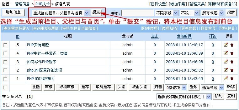 | 調用舉例:[phomenews]1,5,30,0,0,0,''[/phomenews] 標簽調用含義:調用欄目ID為1(即PHP技術欄目)下的最新5條信息,標題顯示30個字節。參數說明: | ||||||||||||||||||