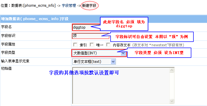 設置說明:新建的字段名 必須填為diggtop;字段標識 可根據需要自由設置,本例填為“頂”; 字段類型 選擇大數值型(INT);字段的其他選項按默認設置提交即可。