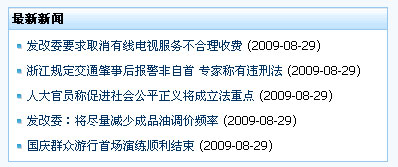 <table width="380" border="0" cellpadding="3" cellspacing="1" bgcolor="#96C8F1" align="center"> <tr> <td background="template/default/images/bg_title_sider.gif"><b>最新新聞</b></td> </tr> <tr> <td bgcolor="#FFFFFF"> <table width="100%" border="0" cellspacing="0" cellpadding="0"> <?php $spacesql=espace_eloop(2,5,0,0); while($spacer=$empire->fetch($spacesql)) { $spacesr=espace_eloop_sp($spacer); ?> <tr> <td height="25"> <img src="template/default/images/li.gif" width="15" height="10"><a href="<?=$spacesr[titleurl]?>" target="_blank"><?=$spacer[title]?></a> (<?=date('Y-m-d',$spacer[newstime])?>) </td> </tr> <? } ?> </table> </td> </tr> </table> |