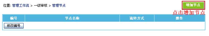 | 4、進(jìn)入工作流節(jié)點(diǎn)管理頁(yè)面,然后點(diǎn)擊“增加節(jié)點(diǎn)”按鈕,進(jìn)入增加工作流節(jié)點(diǎn)界面: |