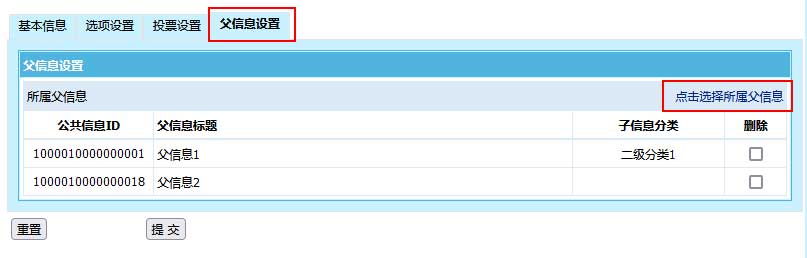 2、增加父信息后,增加信息時就會有選擇父信息選項設置,可以選擇多個父信息及子信息分類: