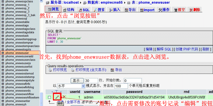帝國網站管理系統英文名EmpireCMS,簡稱“帝國CMS”,忘記帝國CMS網站后臺登錄密碼時, 可以通過phpmyadmin軟件 修改網站數據庫中的phome_enewsuser數據表進行密碼重置操作:(其中phome_是表前綴)