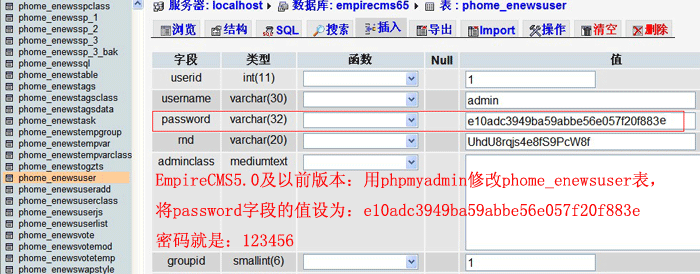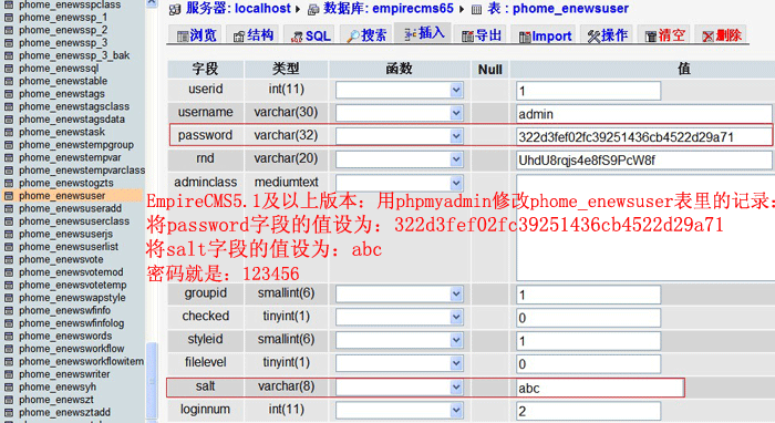 二、【網站使用帝國CMS5.1版本~7.2版本時】: 5.1至7.0版本 用phpmyadmin修改phome_enewsuser表里的記錄:把password字段的值設為:“322d3fef02fc39251436cb4522d29a71”;把salt字段的值設為:“abc”. 后臺登錄密碼就是:123456