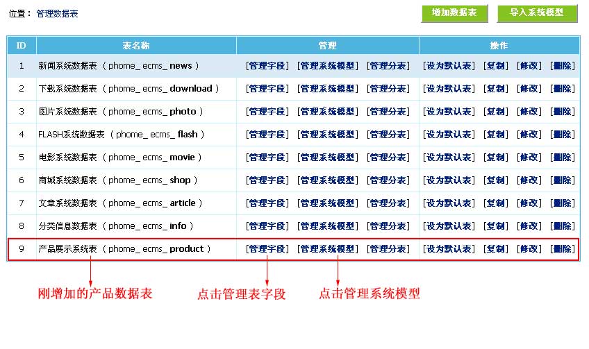 | 1、登錄后臺->“系統(tǒng)”->“數(shù)據(jù)表與系統(tǒng)模型”->“管理數(shù)據(jù)表”->點(diǎn)擊產(chǎn)品數(shù)據(jù)表的“管理系統(tǒng)模型”->“增加系統(tǒng)模型”,進(jìn)入如下界面: |