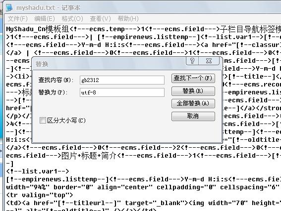 2.使用替換功能,將gb2312 替換成 utf-8 ,替換完另存為UTF-8編碼,再將名字改回*.temp,到帝國后臺導入,這個模板就成了utf8版同時不會有亂碼。
