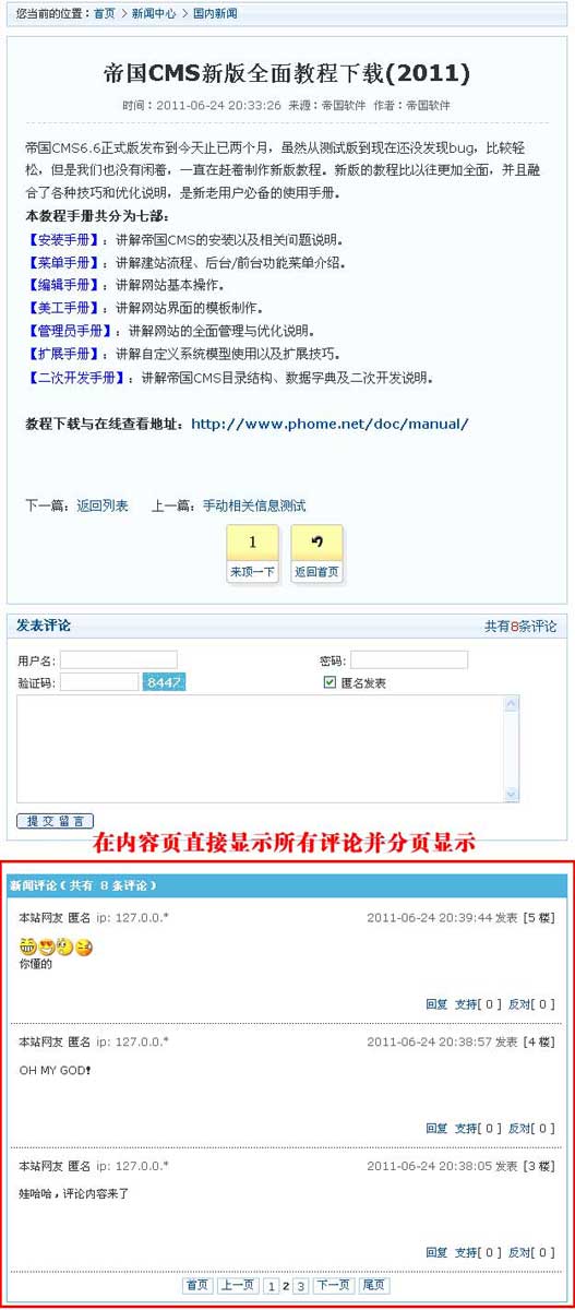 插件介紹:帝國CMS的內容頁評論AJAX分頁顯示插件,可在靜態內容頁顯示所有評論及分頁顯示。
