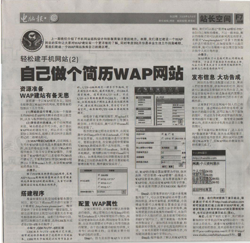 2009年6月8日 《電腦報》第22期 以標題為“輕松建手機網站:自己做個簡歷WAP網站”對【帝國CMS】的WAP功能使用進行了報道。