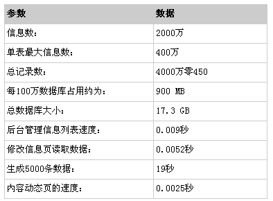 帝國CMS 6.0版本最重要的升級功能是對系統構架進行升級,構架更加完美、負載容量更大。然而很多人就問,這個全新的構架有多大的魅力、容量是多少?其實我也不能準確的告訴你,因為6.0剛發布不久并且沒有空閑時間測試,那時我只能告訴你“總體容量可無限放大,單表存放容量是原來的幾十倍、甚至更多,副表數據量達到一定大小后可設置分表,副表支持無限分表,因而副表容量是無限的”。然而理論是需要實踐去驗證的,所以趁著這兩天比較空閑試著測試,并且測試結果令我非常吃驚,