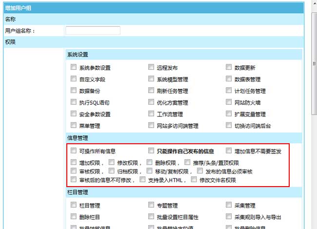 1、用戶組新增權(quán)限:可設(shè)置后臺(tái)管理員增加信息是否支持錄入html權(quán)限。