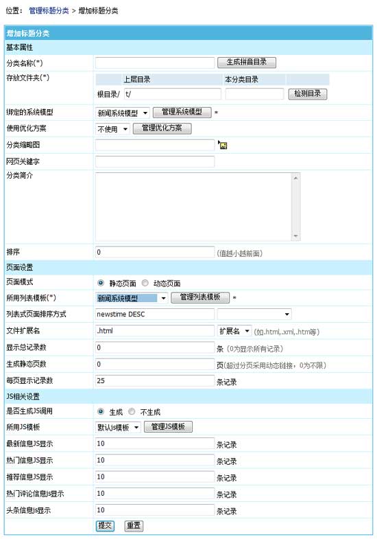 帝國CMS7.0對信息標題分類功能進行升級,功能更強大: 1、標題分類支持生成靜態頁面,并且可設置存放目錄。