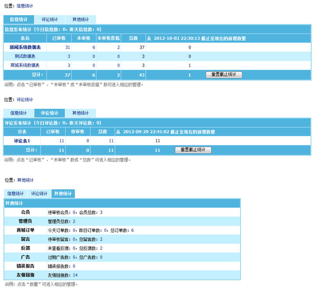 帝國CMS7.0新增統(tǒng)計最新信息與評論數(shù)量,讓管理員更方便了解最新狀況: