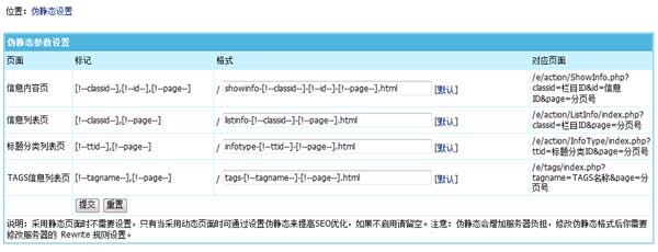 支持設置信息內容頁、欄目頁、標題分類頁、TAGS列表頁及各分頁偽靜態設置。