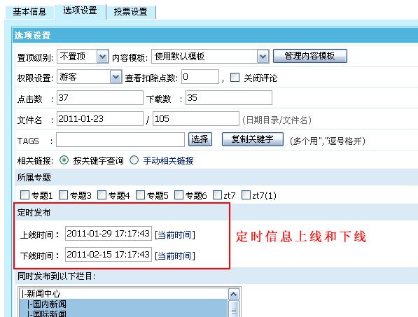 帝國CMS 6.6版新增信息定時上線和下線功能,可預先增加信息,更方便。
