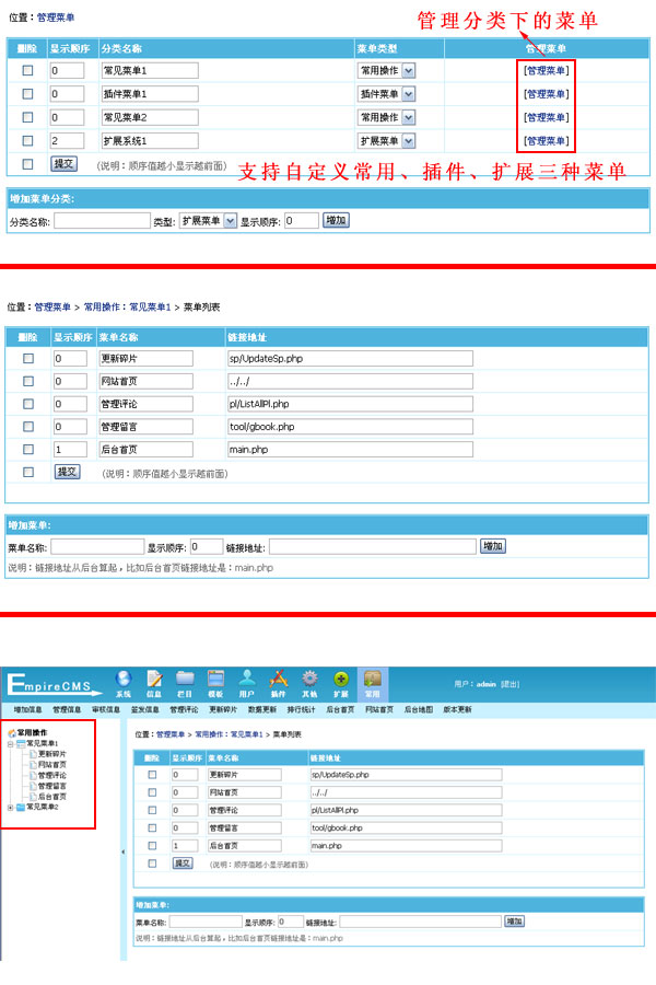 帝國CMS 6.6版新增常用操作、插件菜單及擴展菜單自定義功能,擴展系統更方便。